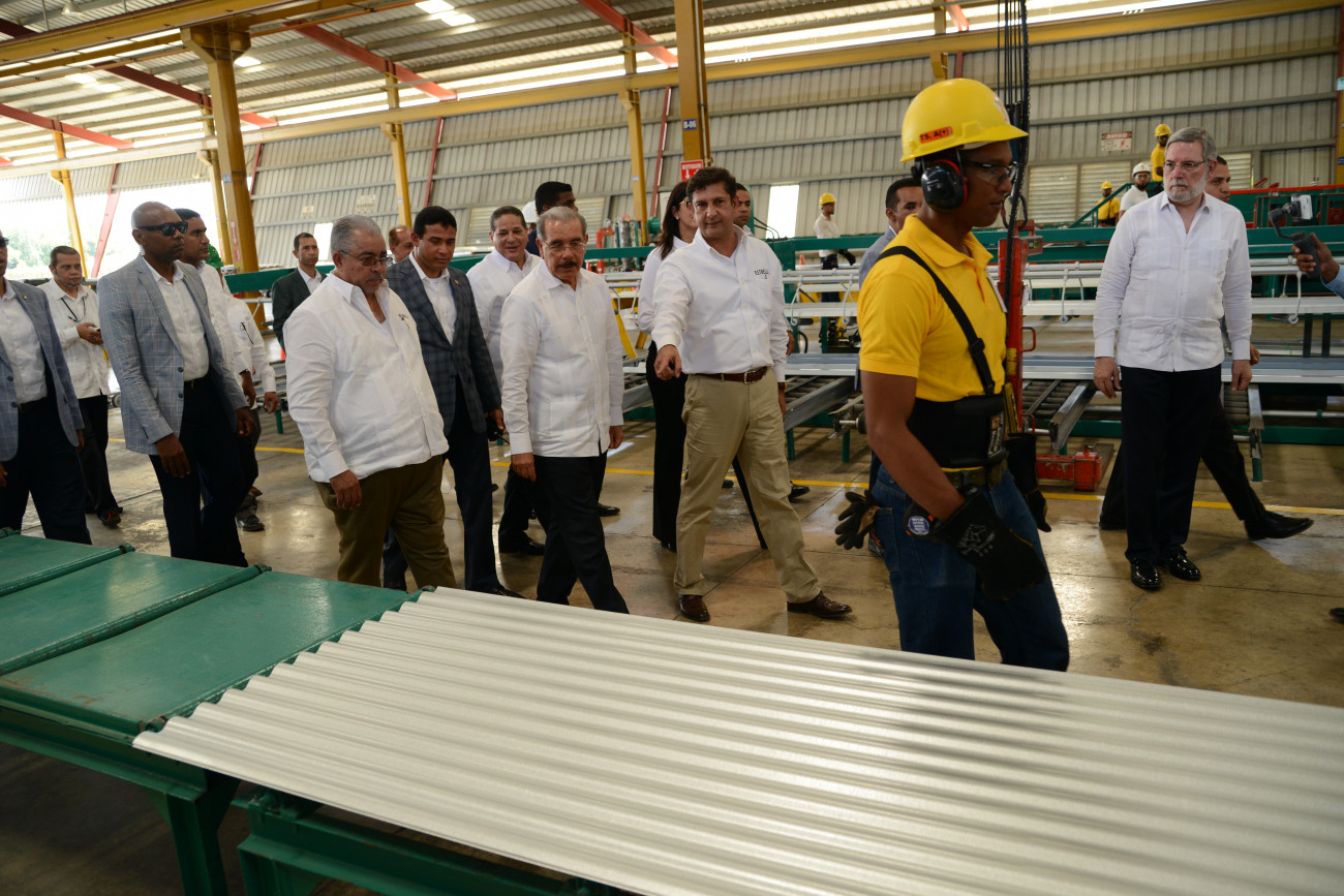 El presidente Danilo Medina en compañía del empresario Manuel Estrella, durante su visita a la planta de láminas de Aluzinc North West Industries (NWI), del Grupo ESTRELLA, ubicada en Villa Vásquez, provincia Montecristi.