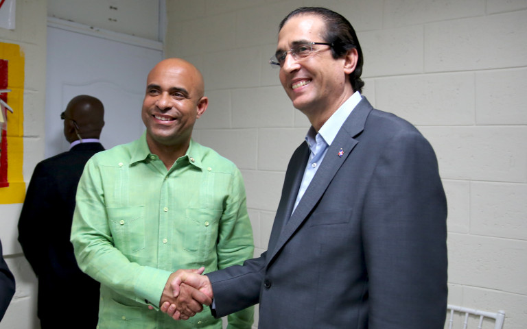 Gustavo Montalvo, ministro de la Presidencia de la República Dominicana y el primer ministro de Haití, Laurent Lamothe, mientras se saludan durante el encuentro denominado Diálogo RD-Haití, efectuado hoy en una de las naves de la Compagnie Industriel Development (CODEVI),en Juana Méndez, Haití; inversión dominicana radicada aquí, que genera más de 7 mil empleos.