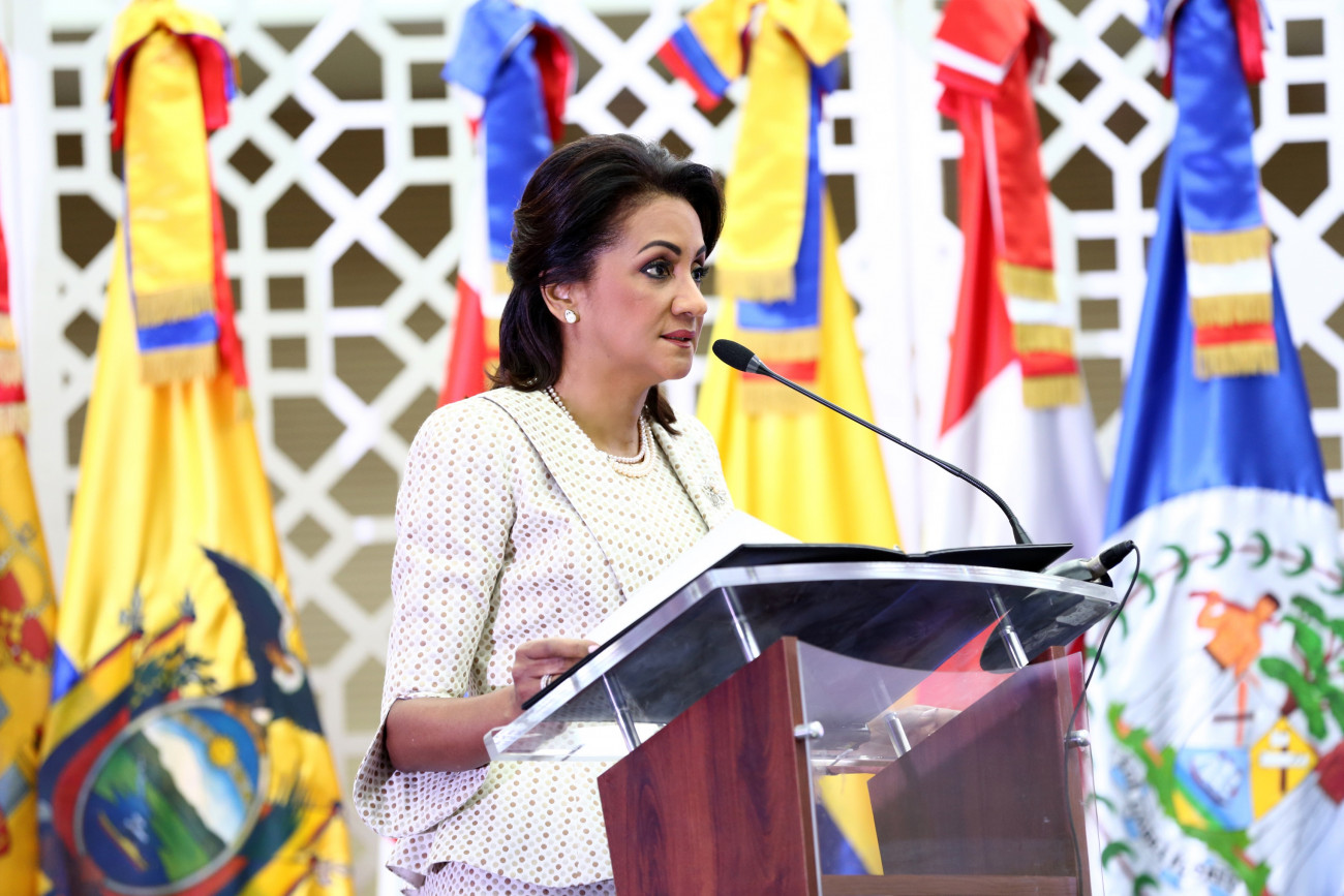La Primera Dama de la República, Cándida Montilla de Medina durante su exposición ante el cuerpo diplomático acreditado en el país, para informarles sobre el Torneo Invitacional Mundial de Tenis.