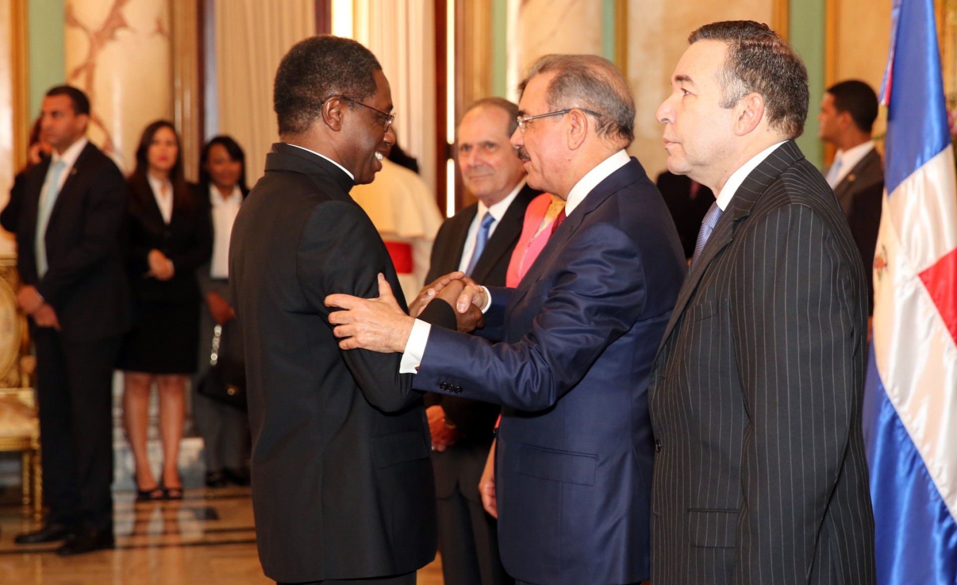 El presidente Medina y su señora esposa mientras reciben los saludos de parte de su excelencia reverendísima, monseñor Jude Thaddeus Okolo, nuncio apostólico de Su Santidad y decano del Cuerpo Diplomático y Consular en el país, presente en la actividad.