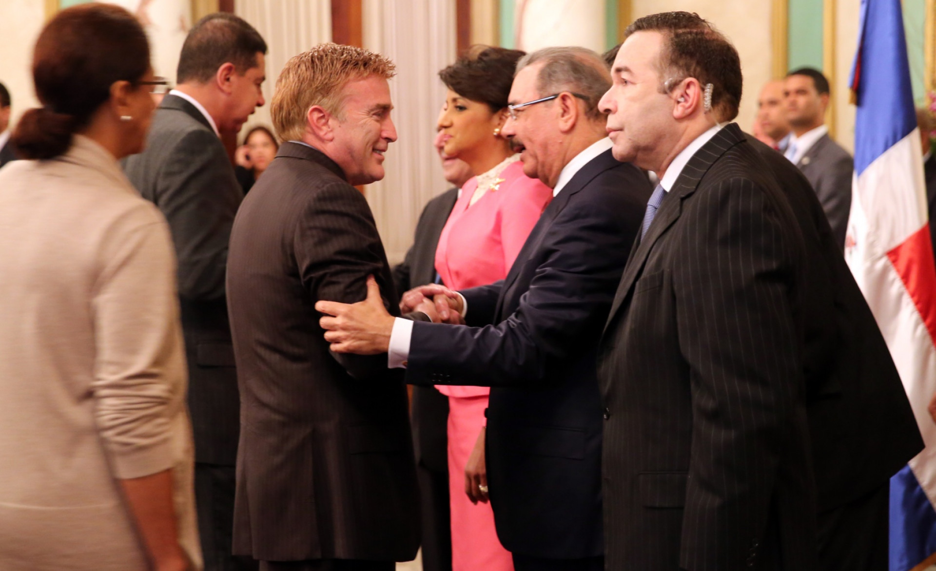 El presidente Danilo Medina acompañado de su esposa, al momento de recibir los saludos del embajador de Estados Unidos en el país, James Walter Brewster, por motivo de Año Nuevo, durante acto celebrado en el Salón de Embajadores del Palacio Nacional.