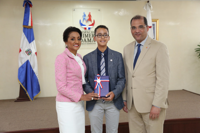 La primera dama de la República, Cándida Montilla de Medina, con uno de los estudiantes galardonados y el embajador dominicano en España, Olivo Andrés Rodríguez Huertas.
