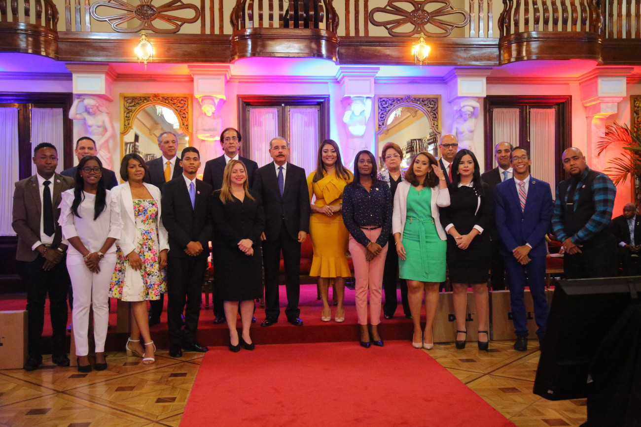 El presidente Danilo Medina junto al grupo de jóvenes meritorios; las ministras de la Juventud, Robiamny Balcácer y de Educación Superior Ciencia y Tecnología, Alejandrina Germán, entre otros altos funcionarios presentes en el evento.