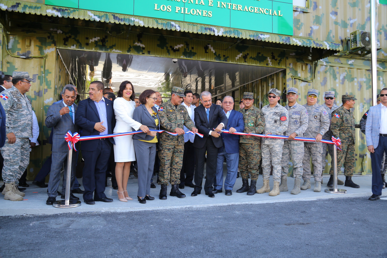 El presidente Danilo Medina cortó la cinta inaugural para dejar aperturado el nuevo recinto militar. Le acompañan, el ministro de Defensa, teniente general Rubén Darío Paulino Sem; el ministro de Interior y Policia, José Ramón Fadul; el jefe de la Policía Nacional, Gral. Ney Aldrin Bautista Almonte, entre otras personalidades.