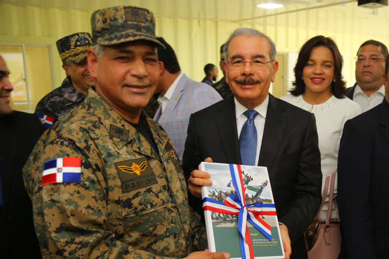 El presidente Danilo Medina recibió explicaciones del ministro de Defensa, teniente general Rubén Darío Paulino Sem, durante su recorrido por las instalaciones del puesto militar.