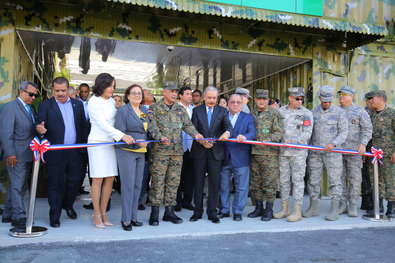 El presidente Danilo Medina cortó la cinta inaugural para dejar aperturado el nuevo recinto militar. Le acompañan, el ministro de Defensa, teniente general Rubén Darío Paulino Sem; el ministro de Interior y Policia, José Ramón Fadul; el jefe de la Policía Nacional, Gral. Ney Aldrin Bautista Almonte, entre otras personalidades.