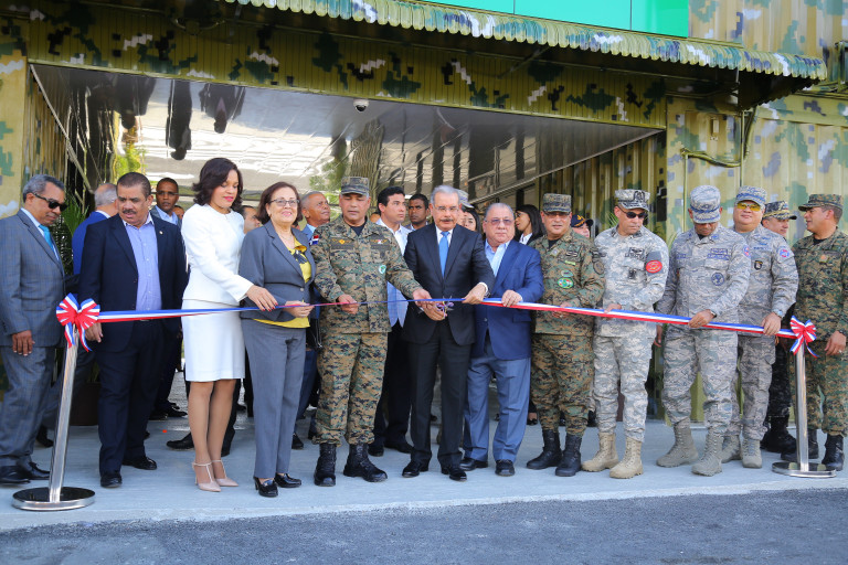 El presidente Danilo Medina cortó la cinta inaugural para dejar aperturado el nuevo recinto militar. Le acompañan, el ministro de Defensa, teniente general Rubén Darío Paulino Sem; el ministro de Interior y Policia, José Ramón Fadul; el jefe de la Policía Nacional, Gral. Ney Aldrin Bautista Almonte, entre otras personalidades.