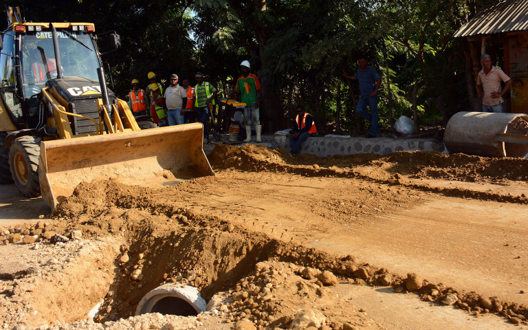 Obreros mientras realizan trabajos de construcción para asfaltado y drenaje de las calles de Cana Chapetón.