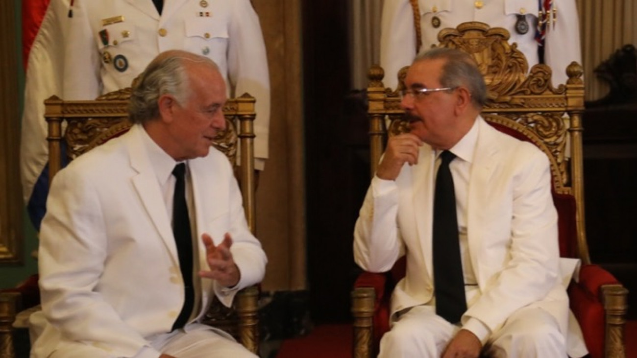 El Presidente de la República Dominicana, Danilo Medina, mientras conversa con el nuevo embajador de la República Oriental del Uruguay, Álvaro Daniel Gallardo.