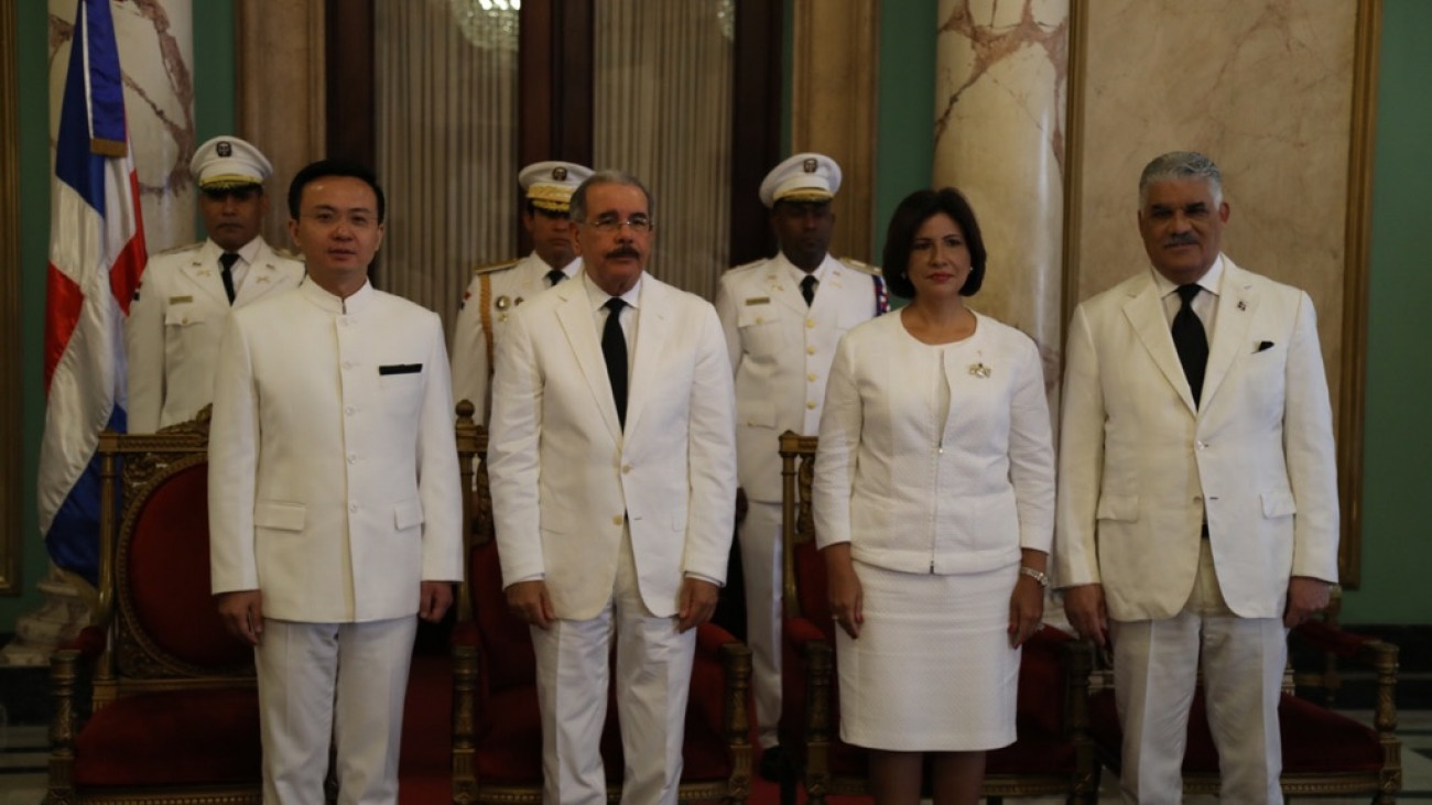 Zhang Run, embajador de la República Popular China, el presidente Danilo Medina, la vicepresidenta Margarita Cedeño de Fernández y el canciller Miguel Vargas Maldonado, durante la ceremonia oficial.