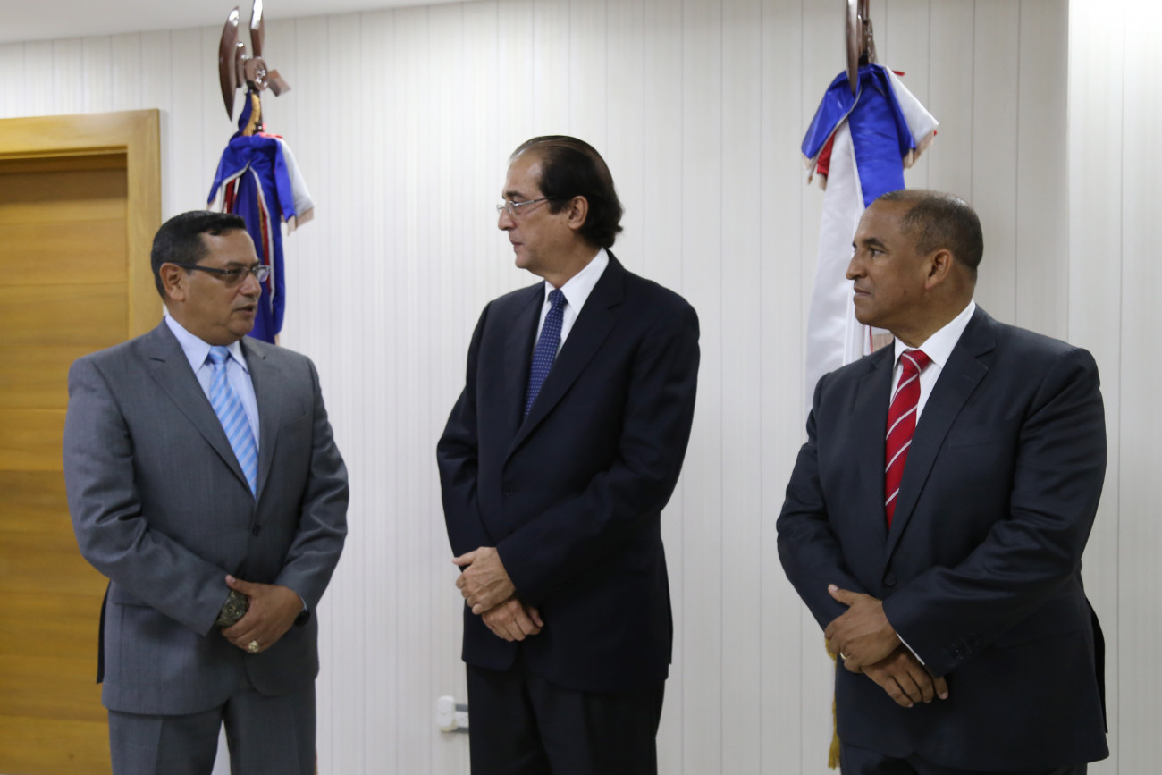 El ministro de la Presidencia, Gustavo Montalvo junto al nuevo presidente de la DNCD, mayor general del Ejército de la República Dominicana, José Eugenio Matos de la Cruz, y el funcionario saliente vicealmirante Félix Pimentel.