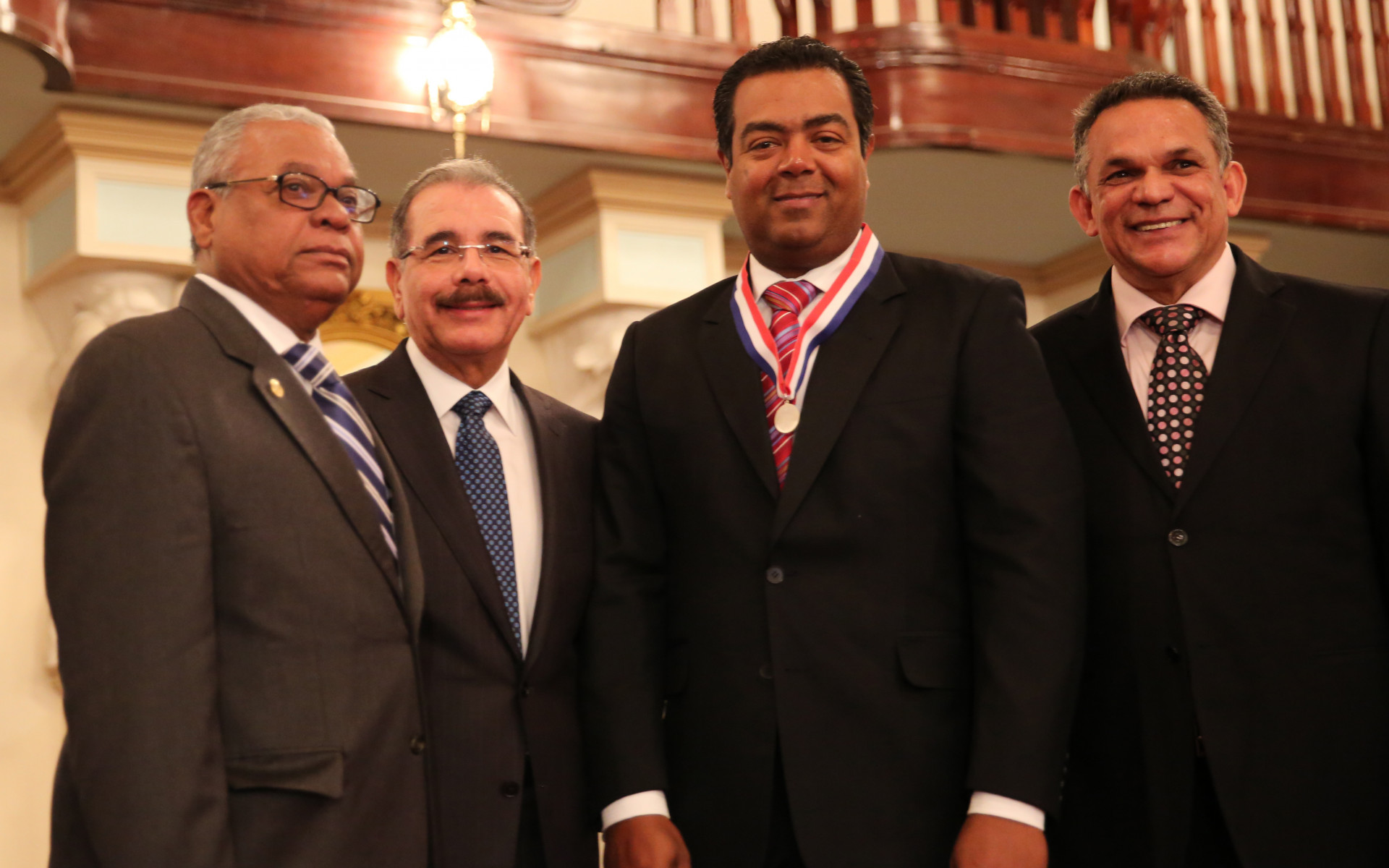Participación del presidente Danilo Medina Sánchez y Elisaben Matos, director Ejecutivo de la Administradora de Riesgos Laborales Salud Segura, ganadores de medalla de plata durante el acto de premiación. Figura además el ministro de Ventura Camejo.