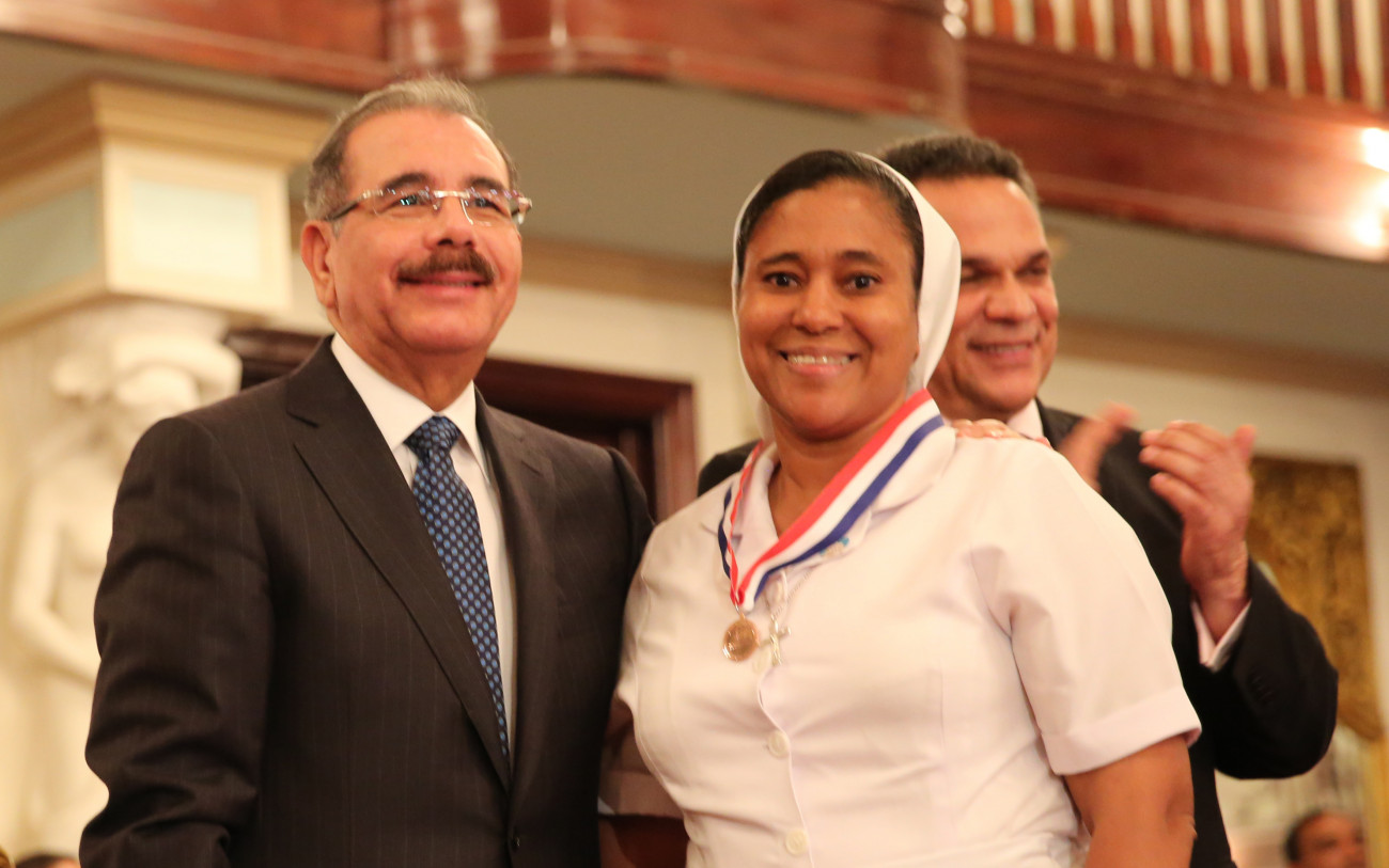 Presidente Danilo Medina y representante de la Escuela Parroquial Cristo Rey, galardonada con medalla de bronce del Gran Premio Nacional a la Calidad 2014, por su destacada labor en favor de la educación dominicana.