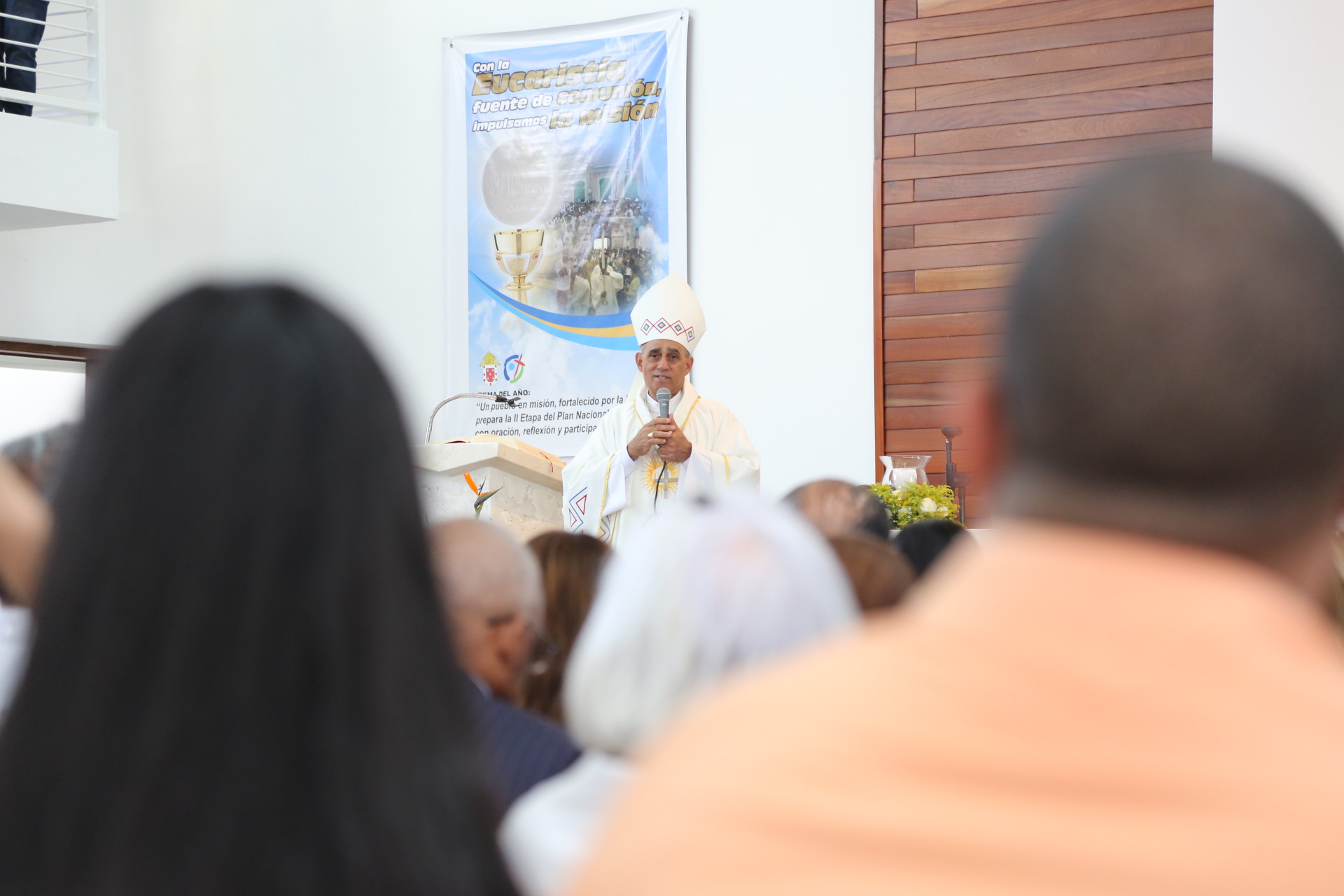 La nueva iglesia fue inaugurada con una eucaristía oficiada por monseñor Bretón Martínez, arzobispo de la Arquidiócesis de Santiago, quien recibió las llaves de manos de la primera dama.