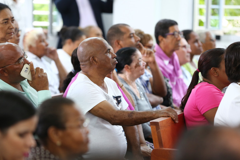 La nueva iglesia fue inaugurada con una eucaristía oficiada por monseñor Bretón Martínez, arzobispo de la Arquidiócesis de Santiago, quien recibió las llaves de manos de la primera dama.