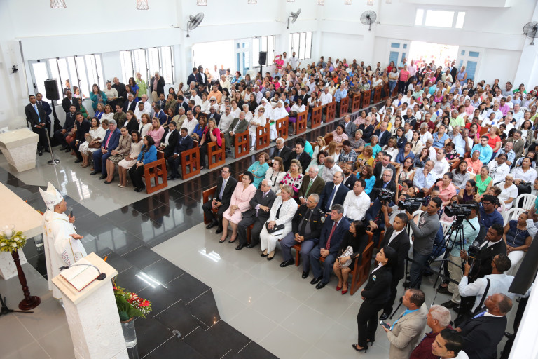 La nueva iglesia fue inaugurada con una eucaristía oficiada por monseñor Bretón Martínez, arzobispo de la Arquidiócesis de Santiago, quien recibió las llaves de manos de la primera dama.