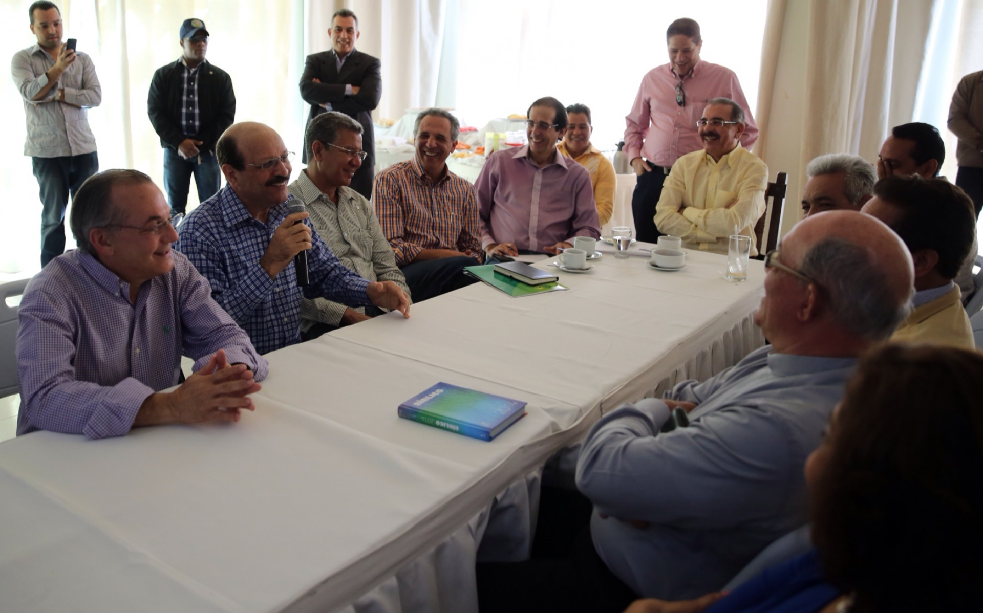 Reunión del presidente Medina con lideres municipales, presentes en durante su visita sorpresa a productores de esta comunidad. Figuran, los ministros Gustavo Montalvo, José Ramón Peralta, y el director del Fondo Especial de Desarrollo Agropecuario (FEDA), Antonio López, entre otros.