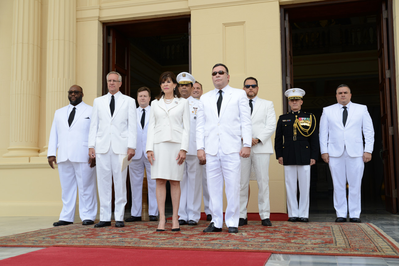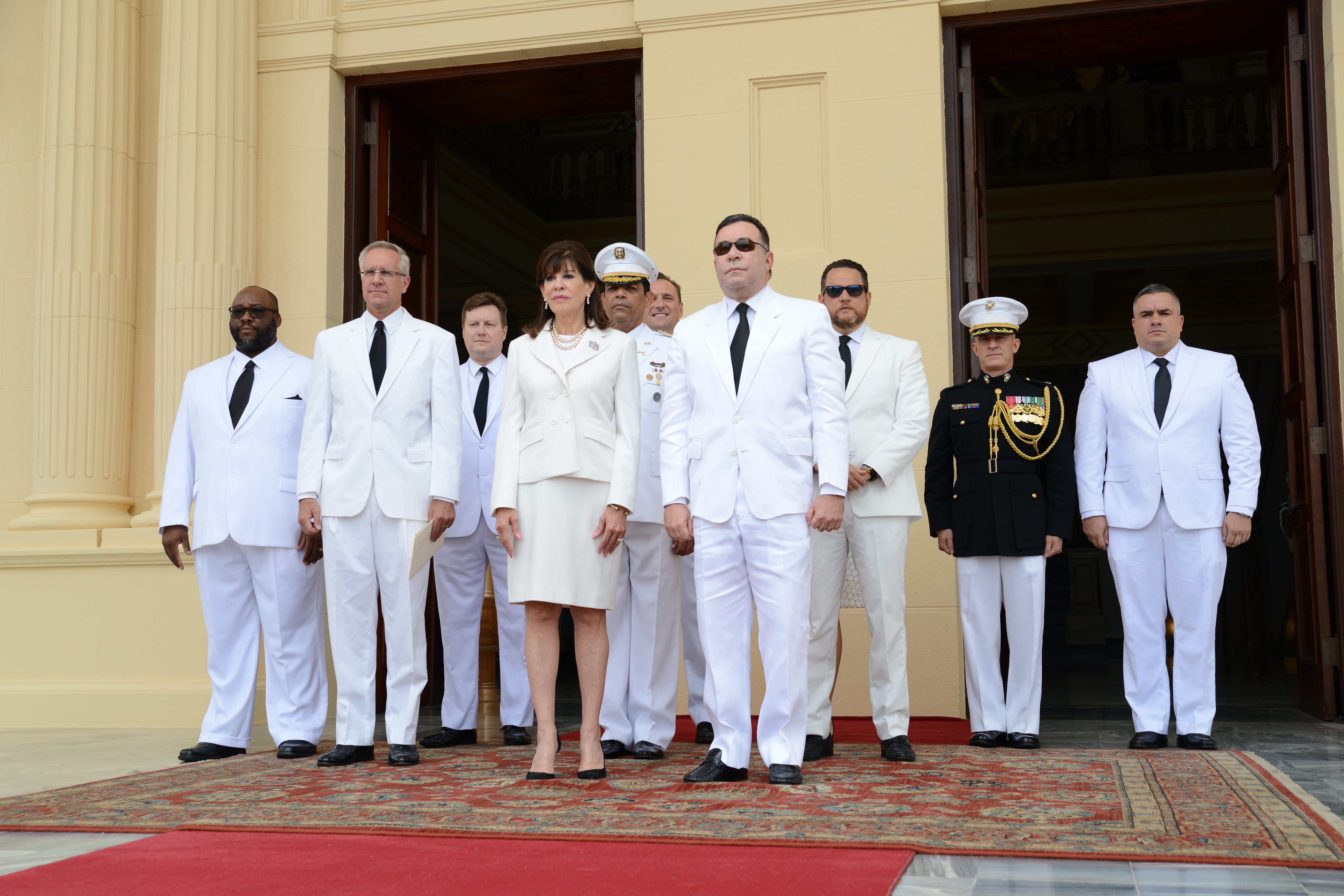 Embajadora de los Estados Unidos para la República Dominicana, Robin Bernstein al ser recibida por el director de ceremonial de Estado y Protocolo de Estado, Pedro Gómez, en las escalinatas del Palacio Nacional.