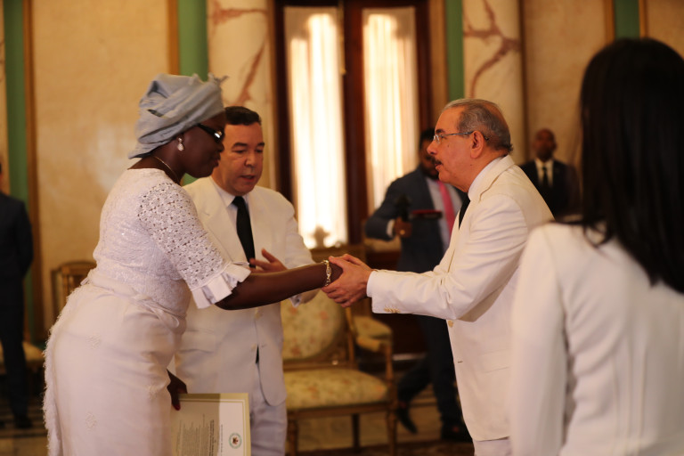 El presidente Danilo Medina recibe la señora Janet Omoleegho Olisa, embajadora de la República Federal de Nigeria en República Dominicana.