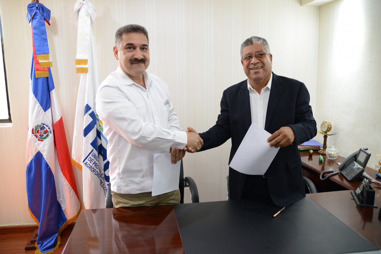 El mayor general Rafael Emilio De Luna Pichirilo (ERD), director ejecutivo de la UTEDPA, y Luciano Bertozzo, coordinador de la Oficina Técnica Provincial de la Provincia Hermanas Mirabal, durante la firma del convenio.