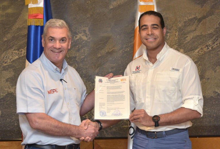 Gonzalo Castillo, ministro de Obras Públicas y Comunicaciones (MOPC), entrega al director ejecutivo de la Comisión Permanente de Titulación de Terrenos del Estado, José Dantés Díaz, la primera licencia de construcción emitida.