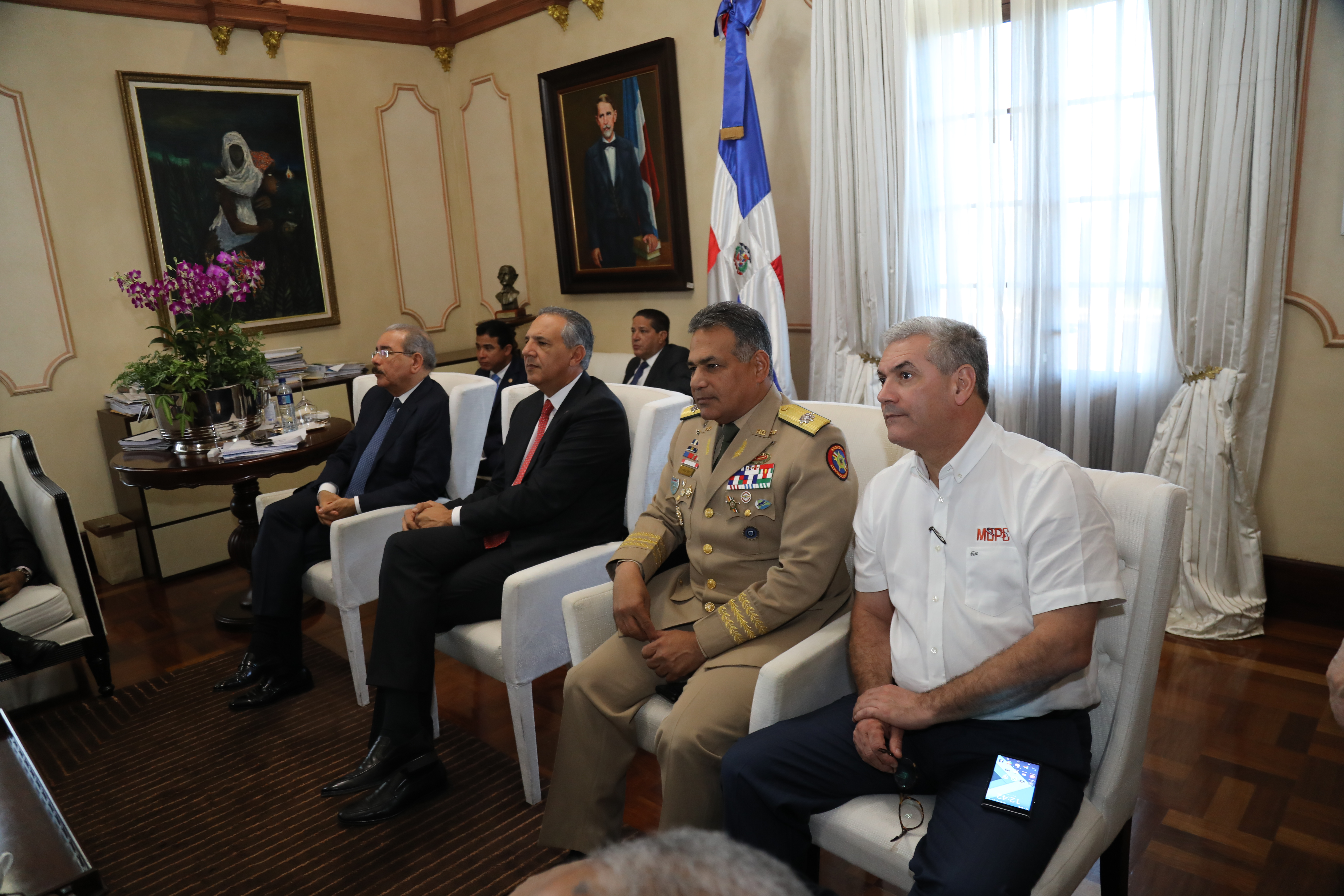 El presidente Danilo Medina, junto a José Ramón Peralta, ministro Administrativo de la Presidencia; el teniente general Rubén Darío Paulino Sem, ministro de Defensa; y Gonzalo Castillo, ministro de Obras Públicas y Comunicaciones.