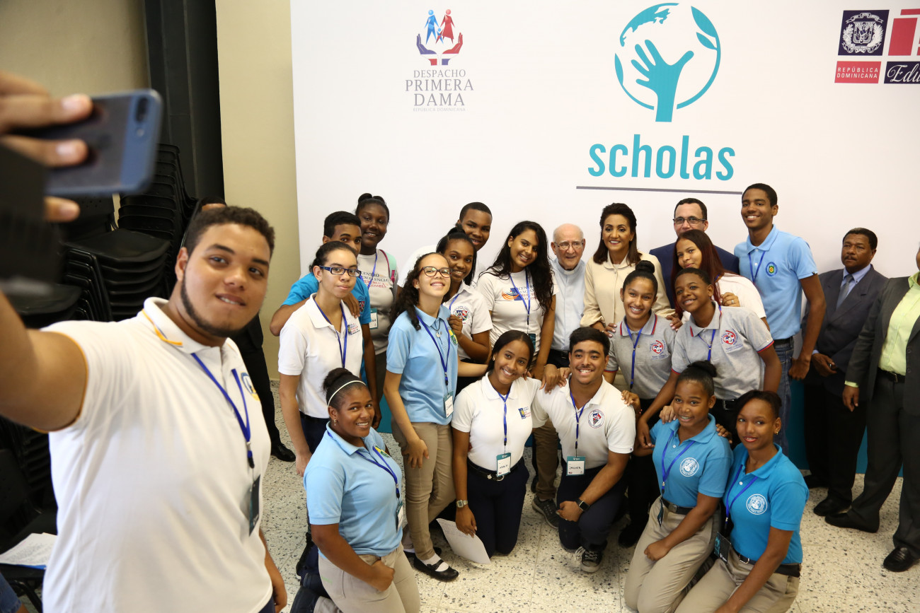 La primera dama Cándida Montilla de Medina y el ministro de Educación, Andrés Navarro, con estudiantes que participaron en el programa educativo Scholas Ciudadanía del Instituto Técnico Salesiano (ITESA), en el sector María Auxiliadora.