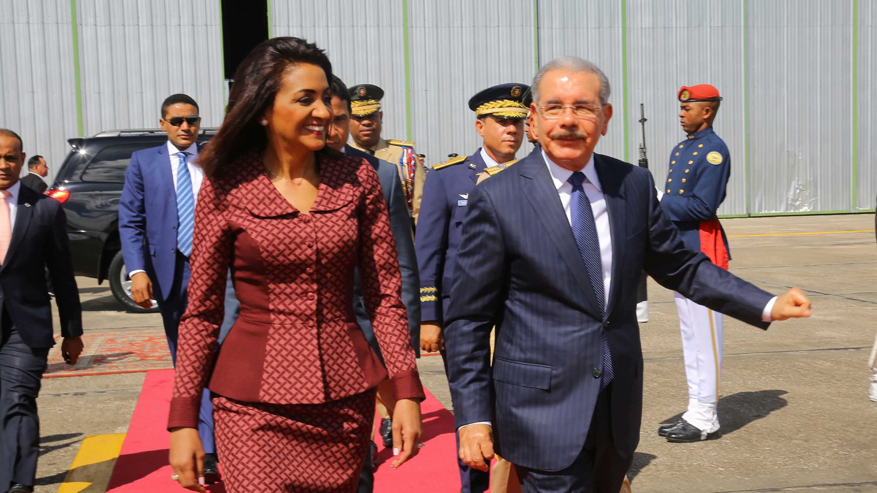El presidente Danilo Medina y su esposa Cándida Montilla de Medina, a su salida desde la Base Aérea de San Isidro, en horas de la mañana.