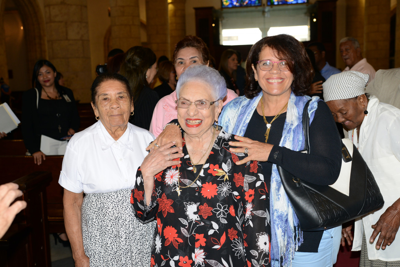 Participantes en la misa y otras actividades celebradas con motivo del Día Internacional del Adulto Mayor, encabezadas por la señora Nathalie María Hernández, directora del Consejo Nacional de la Persona Envejeciente (CONAPE).
