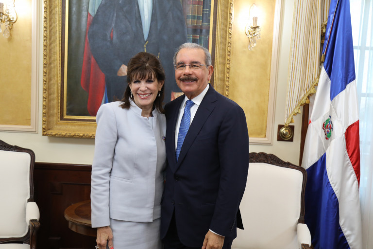 El presidente de la República, Danilo Medina, acompañado de la señora Robin S. Bernstein, embajadora de los Estados Unidos de América ante la República Dominicana, durante el encuentro.