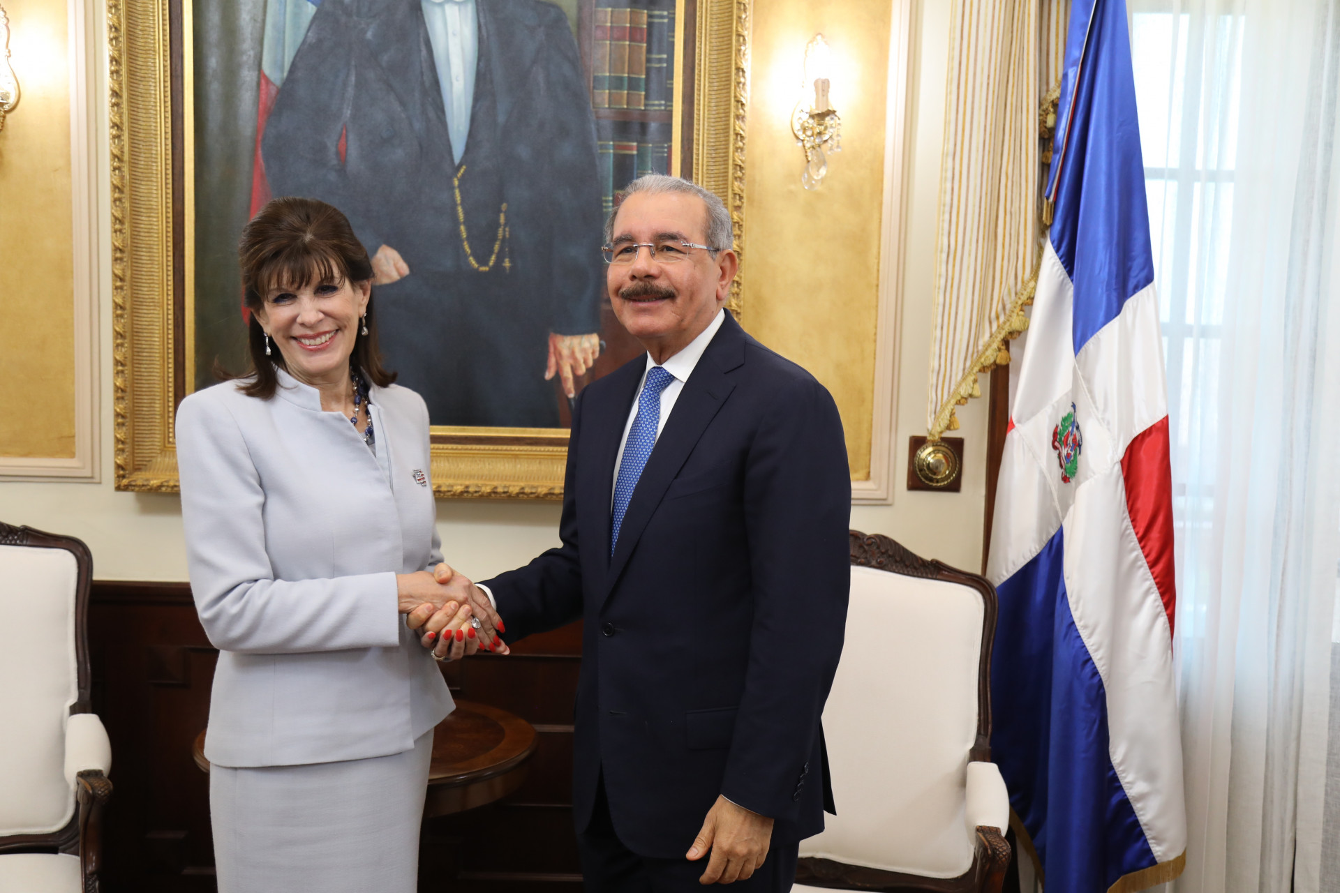 El presidente de la República, Danilo Medina, al recibir la embajadora de los Estados Unidos de América en República Dominicana, Robin S. Bernstein, durante visita de cortesía en el despacho presidencial del Palacio Nacional.
