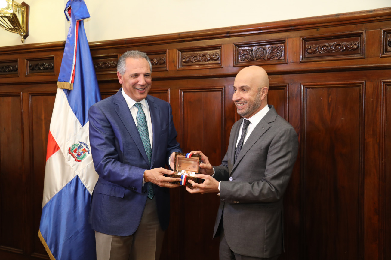 El ministro administrativo de la Presidencia, José Ramón Peralta, y Mohammed Alzarooni, presidente del Consejo de Directores de la Organización Mundial de Zonas Francas, intercambiaron presentes.