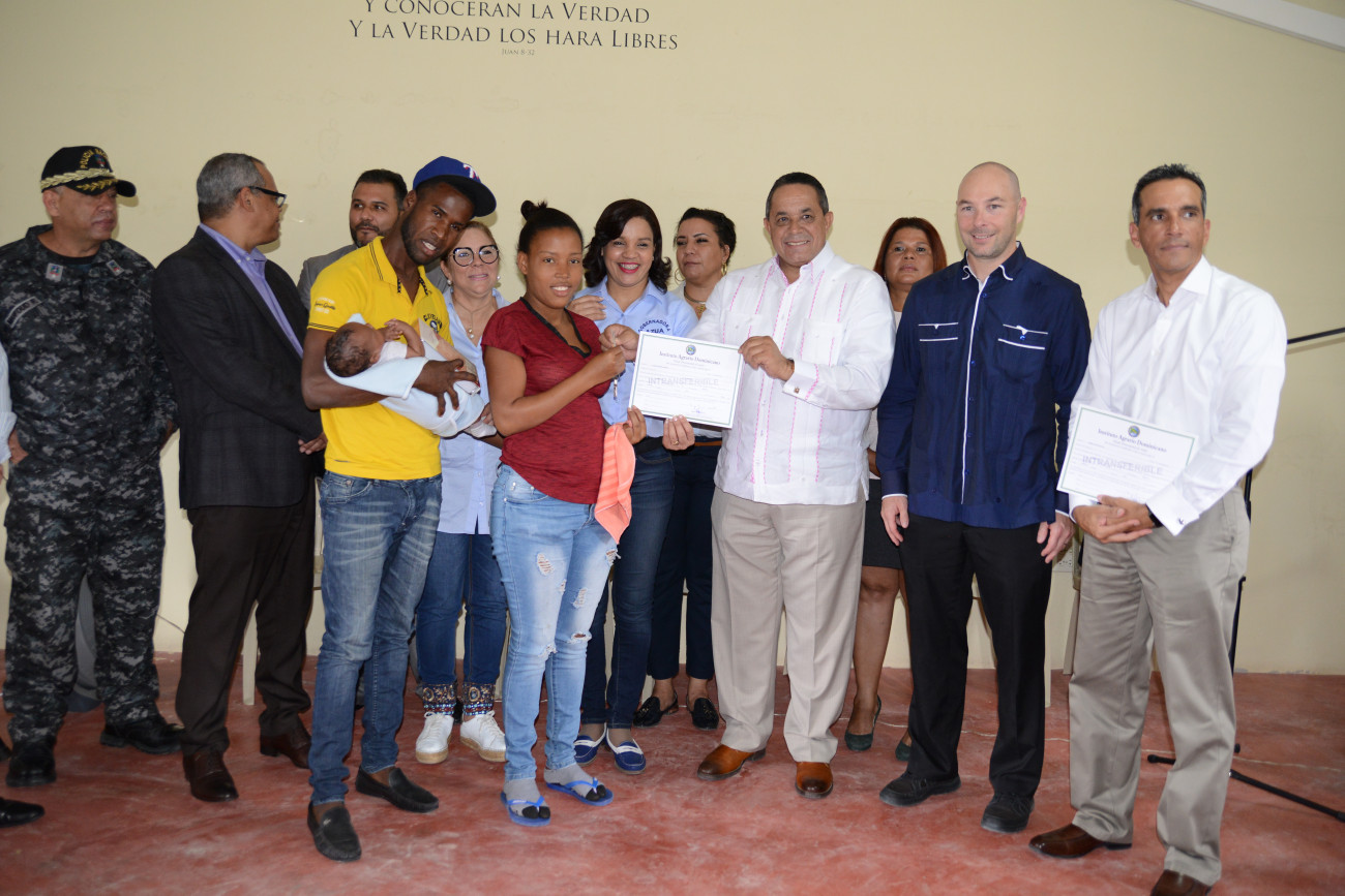 Emilio Toribio Olivo, director general del IAD, la gobernadora de Azua, Walkiria Féliz; Andrew Tattrie, vicepresidente de One More Child, y el viceministro Juan Pumarol, durante la entrega de los títulos provisionales a las familias beneficiadas.