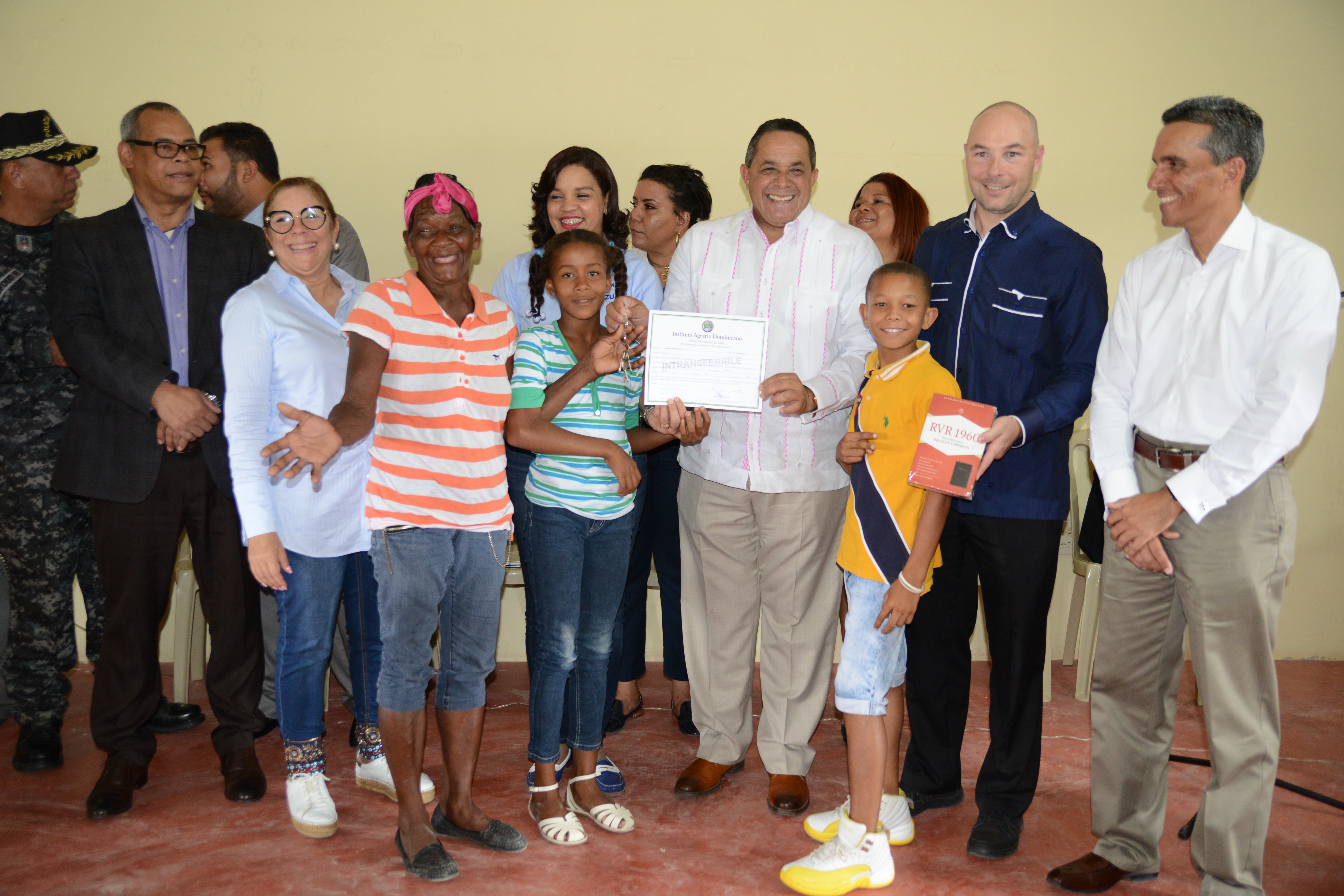 Emilio Toribio Olivo, director general del IAD, la gobernadora de Azua, Walkiria Féliz; Andrew Tattrie, vicepresidente de One More Child, y el viceministro Juan Pumarol, durante la entrega de los títulos provisionales a las familias beneficiadas.