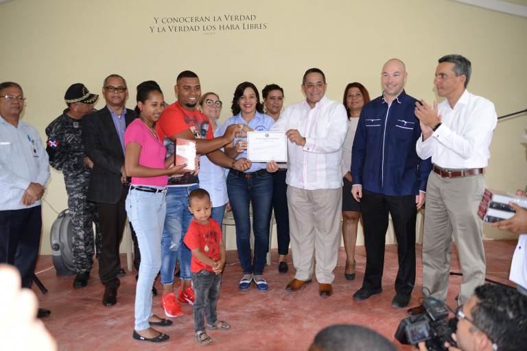 Emilio Toribio Olivo, director general del IAD, la gobernadora de Azua, Walkiria Féliz; Andrew Tattrie, vicepresidente de One More Childe, y el viceministro Juan Pumarol, durante la entrega de los títulos provisionales a las familias beneficiadas.