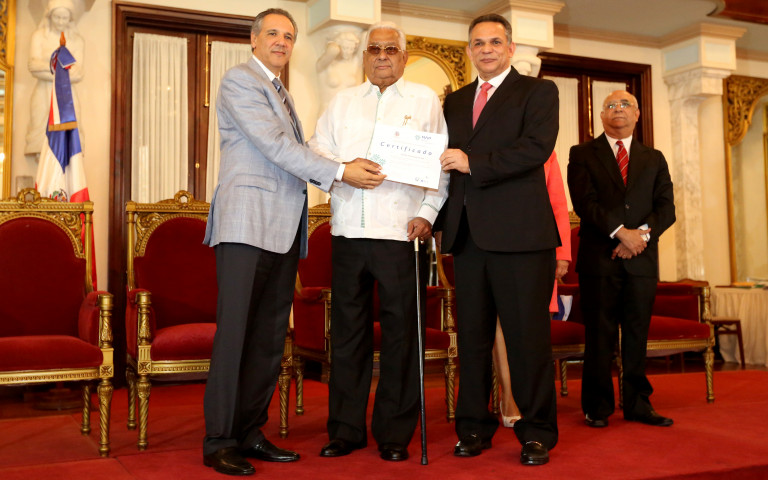 El Superintendente de Seguros Euclides Gutiérrez Félix, es reconocido por sus más de 25 años de labores como servidor estatal. Los ministros, Administrativo de la Presidencia y de Administración Pública, hacen entrega del pergamino.