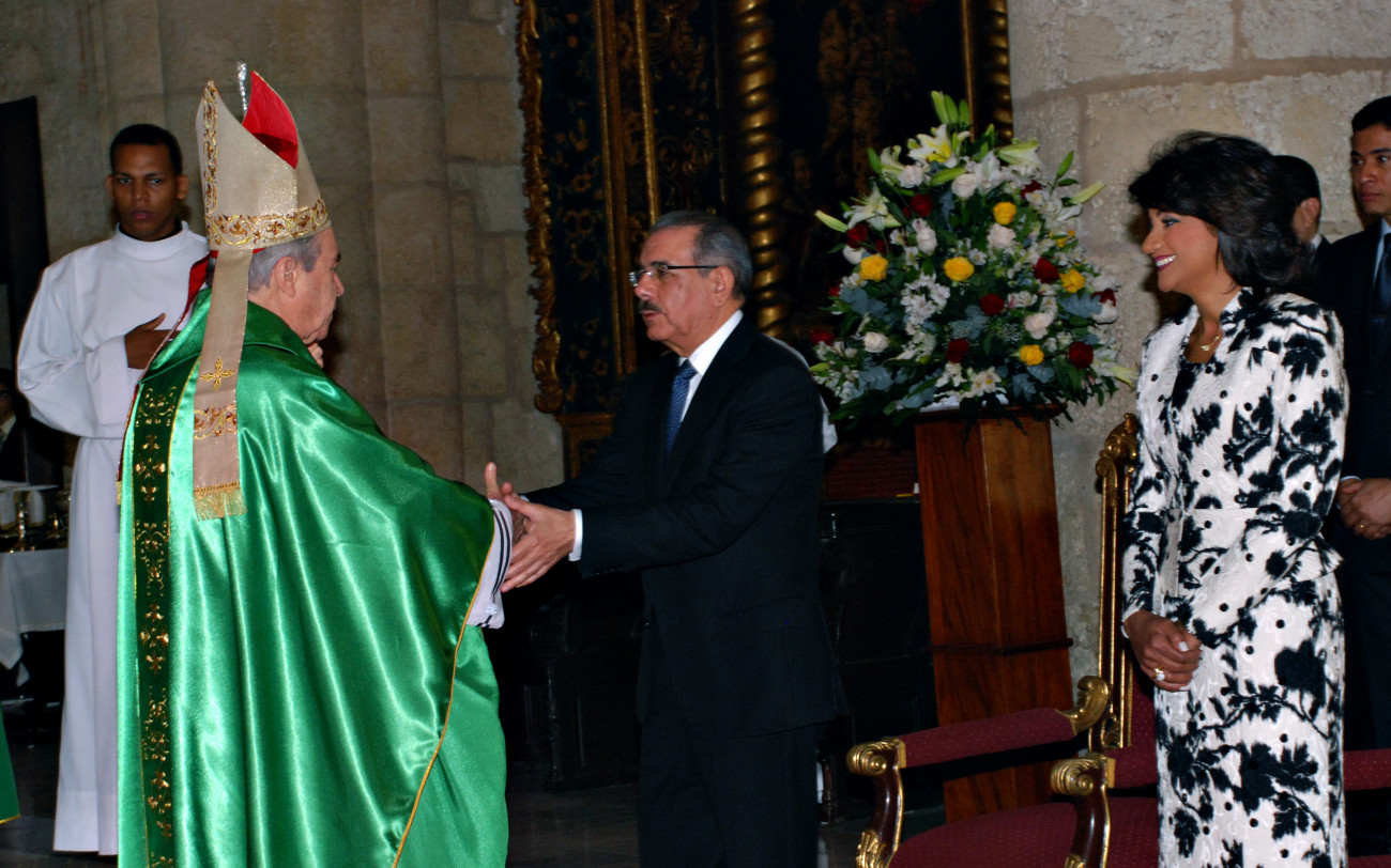 Presidente Danilo Medina y su esposa Cándida Montilla de Medina mientra saludan al cardenal Nicolás de Jesús López Rodríguez, luego de concluir el acto religioso.