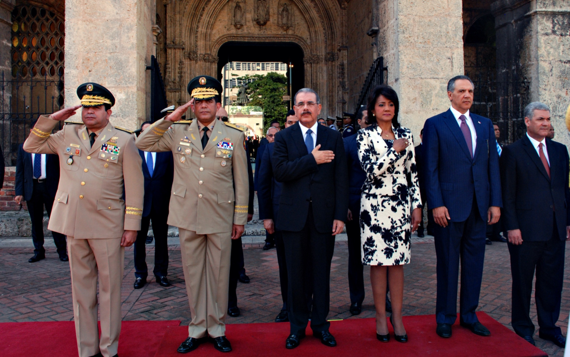 Participación del presidente Medina y su esposa Cándida Montilla de Medina, en la parte frontal de la Catedral Metropolitana Santa María de la Encarnación Primada de América, mientras escuchan la interpretacion del Himno Nacional, al encabezar los actos por el 201 aniversario del Patrico Juan Pablo Duarte. Figuran además los ministros José Ramona Peralta, Gonzalo Castillo y altos mandos militares.