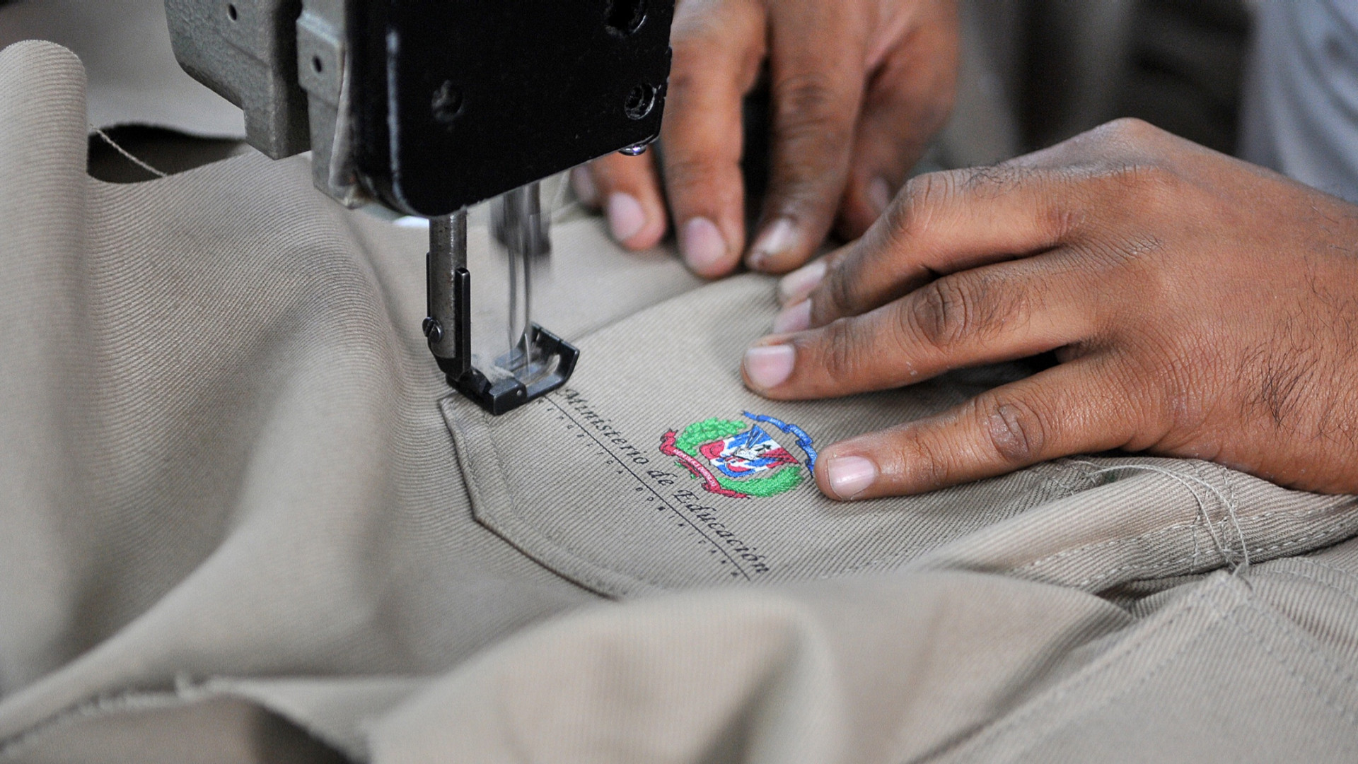 Operarias mientras confeccionan pantalones escolares: Hecho en República Dominicana!