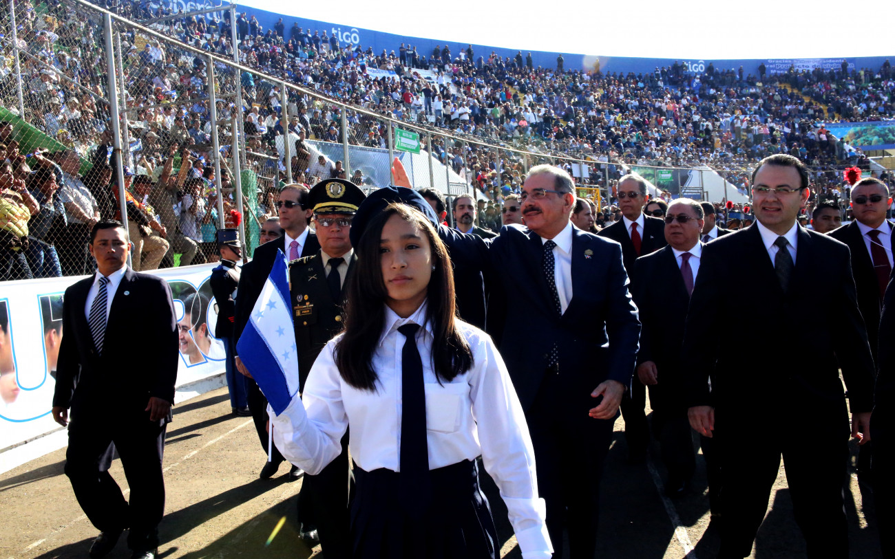 Desfile de la delegación dominicana presidida por el señor presidente Danilo Medina, invitado al acto protocolar por la toma de posesión del nuevo presidente de Honduras, efectuada hoy en el Estadio Nacional Tiburcio Carías Andino, en Tegucigalpa.
