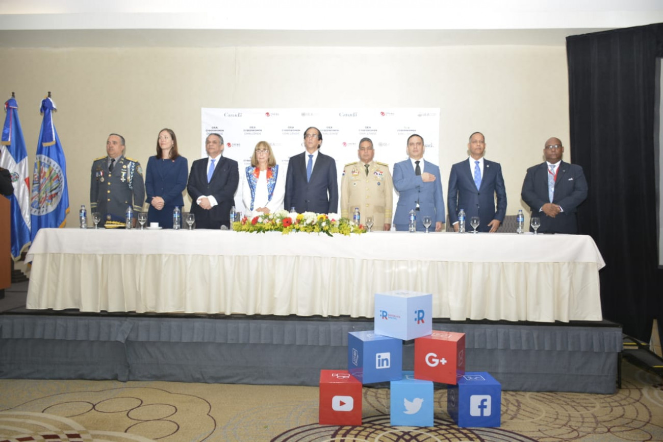 Figuran también en la mesa principal, la representante residente de la Oficina de la Secretaría General de la OEA en República Dominicana, Araceli Azuara; la embajadora de Canadá en el país, Shauna Hermingway; el gerente de Canales Latinoamérica Trend Micro, Ruddy Simmons; el ministro de Defensa, Rubén Darío Paulino Sem; el ministro de Administración Pública, Ramón Ventura Camejo y el presidente del Consejo Directivo del Indotel, Luís Henry Molina; el director de la Policía Nacional, Ney Aldrin Bautista; y el director general de la Oficina Presidencial de Tecnologías de la Información y Comunicación, Armando García.
