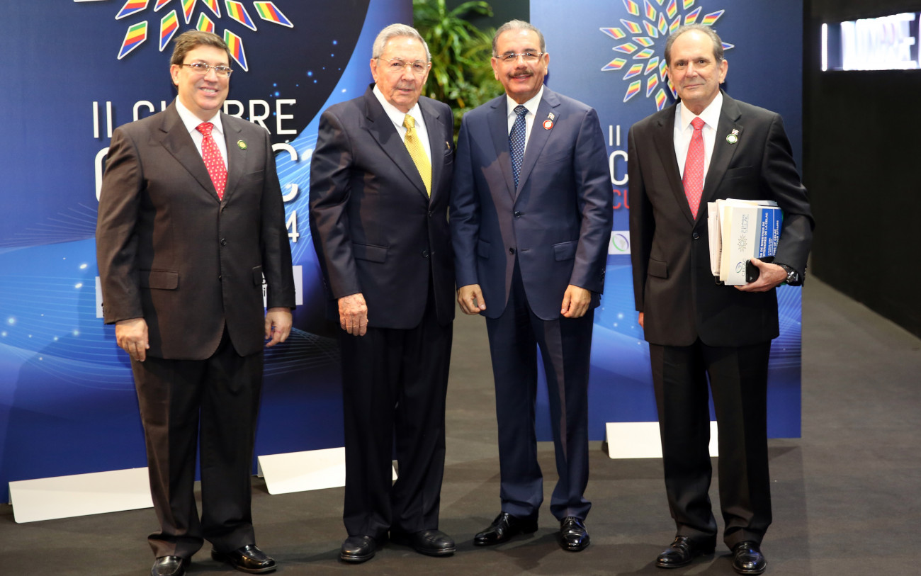 Desde la izquierda, Bruno Rodríguez, ministro de Relaciones Exteriores de Cuba; Raúl Castro, presidente cubano; Danilo Medina, presidente dominicano y José Manuel Trullols, viceministro de Relaciones Exteriores de la República Dominicana, en el recinto ferial de Palacio de Convenciones de La Habana para la celebración del encuentro internacional.