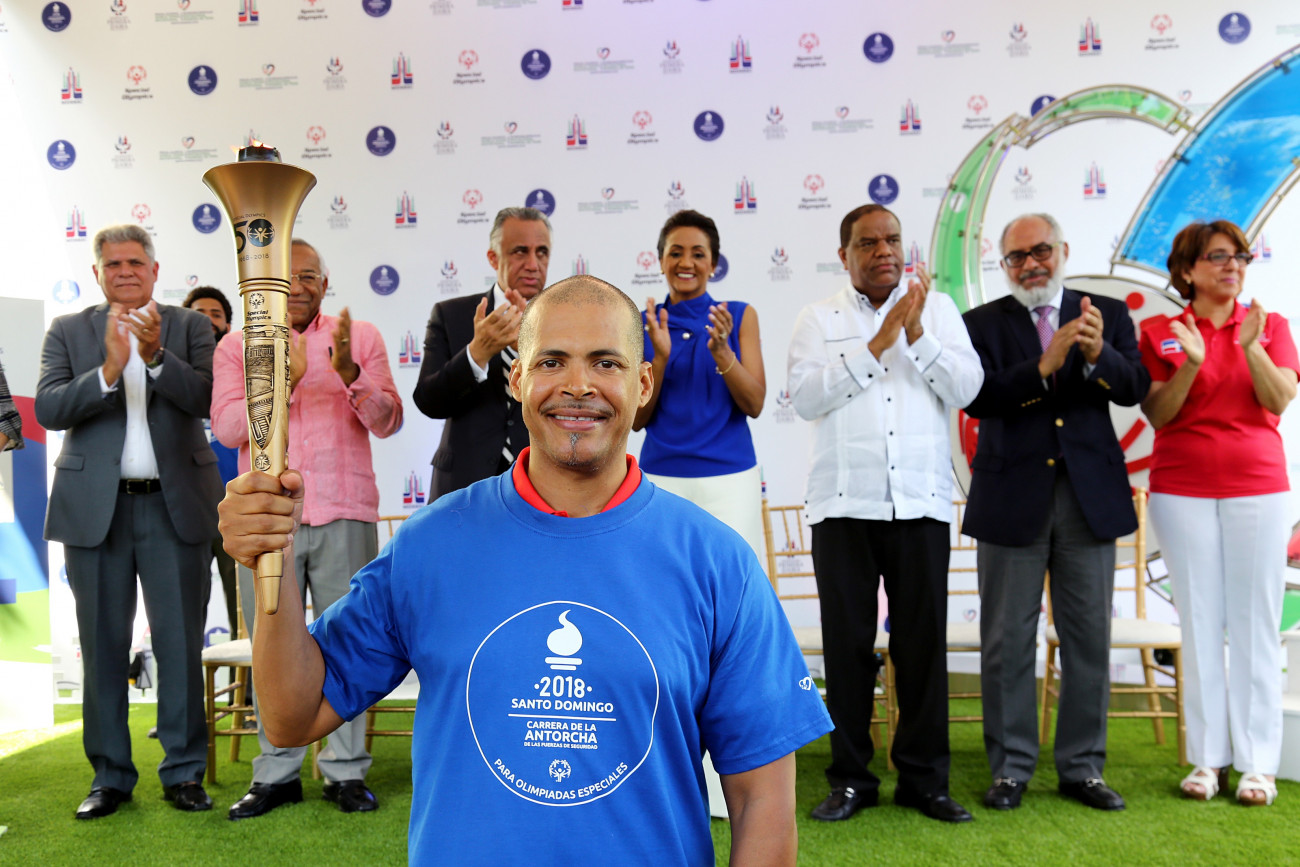 La ruta de la antorcha se inició con la entrega, de parte de la Primera Dama, de la “Llama de la Esperanza”, portadora del mensaje de inclusión de Olimpiadas Especiales, al doble campeón olímpico Félix Sánchez.