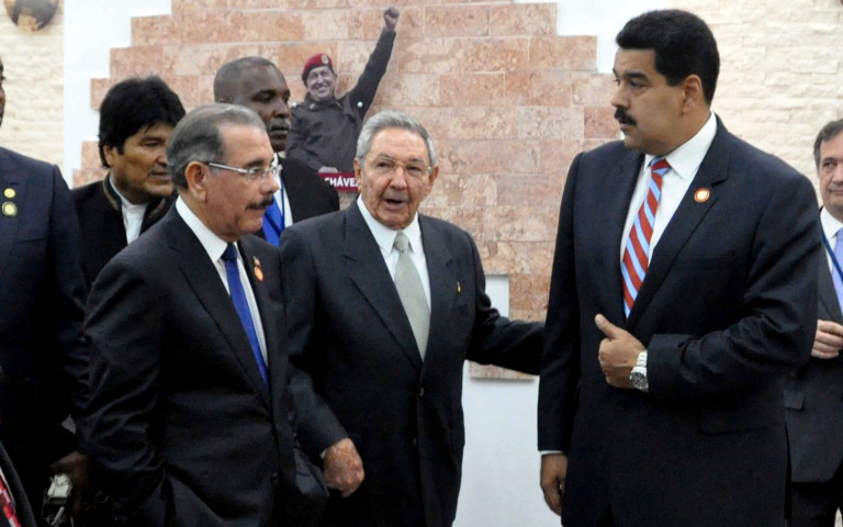 A la izquierda el presidente de la República Dominicana, Danilo Medina, junto a homólogos, general de Ejército Raúl Castro Ruz, presidente de los Consejos de Estado y de Ministros de Cuba, y Nicolás Maduro, presidente de la República Bolivariana de Venezuela, durante acto de inauguración del Museo Hugo Chávez, en el complejo Morro-Cabaña, en La Habana, Cuba.