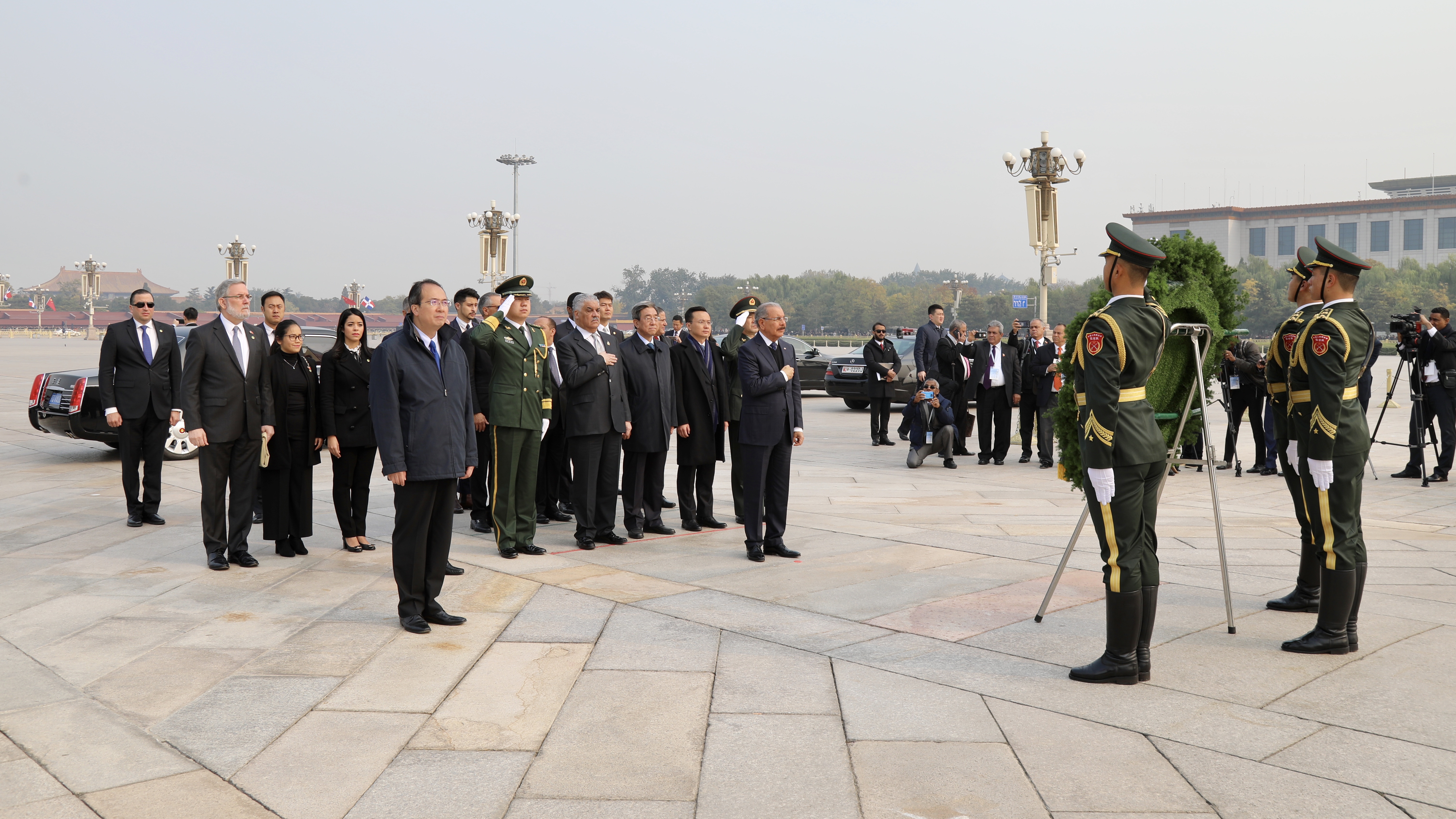El presidente Danilo Medina acompañado de la delegación de funcionarios y empresarios dominicanos, durante ofrenda floral en el Monumento a los Héroes del Pueblo, en la Plaza de Tiananmén, en Pekín.