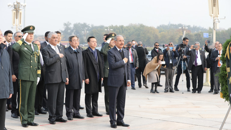 El presidente Danilo Medina acompañado de la delegación de funcionarios y empresarios dominicanos, durante ofrenda floral en el Monumento a los Héroes del Pueblo, en la Plaza de Tiananmén, en Pekín. Foto: Luis Ruiz Tito/Presidencia República Dominicana Enlace noticia: presidencia.gob.do/noticias/danilo-medina-inicia-agenda-e... Video YouTube relacionado: www.youtube.com/watch?v=9vb7W--hkZw