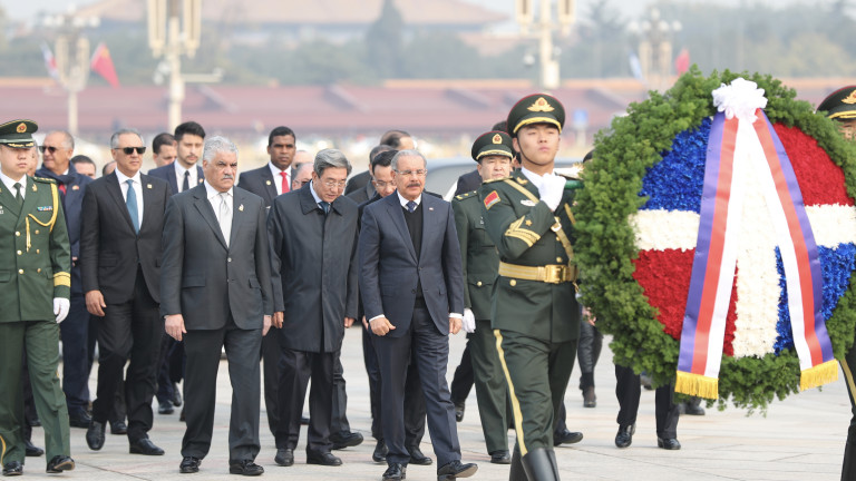 El presidente Danilo Medina acompañado de la delegación de funcionarios y empresarios dominicanos, durante ofrenda floral en el Monumento a los Héroes del Pueblo, en la Plaza de Tiananmén, en Pekín.