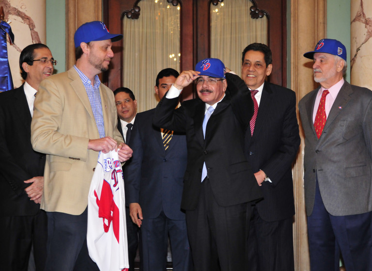 El presidente Medina mientras se coloca la gorra del equipo campeón, a quienes le pidió retornar de la Serie del Caribe “con la Bandera Nacional llena de gloria”, durante el encuentro efectuado en su despacho del Palacio Nacional.