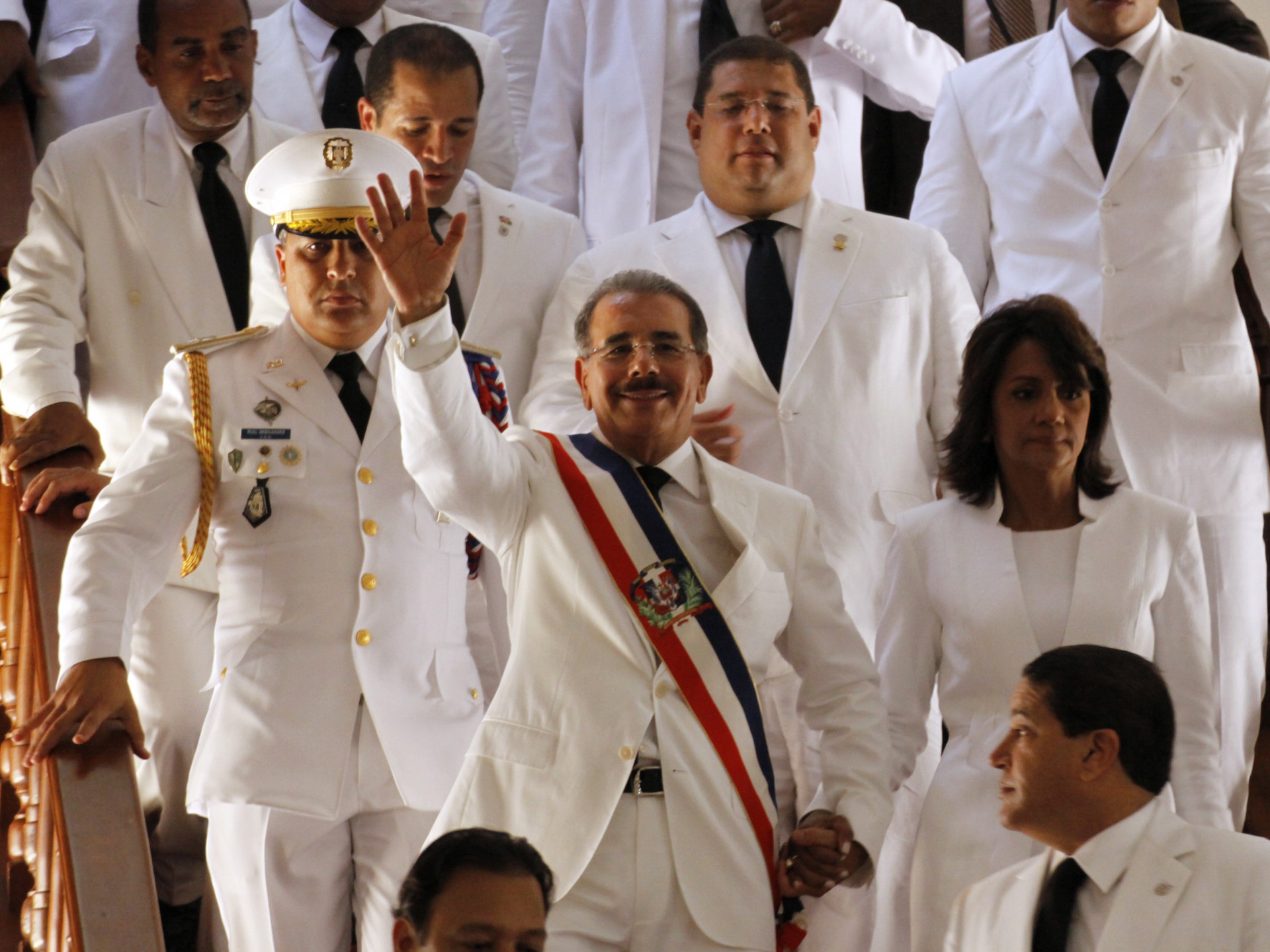 El presidente Danilo Medina y su señora esposa, primera dama,Candy Montilla de Medina, se dirigen a la explanada del Congreso Nacional luego de concluir el acto de traspaso de mando.