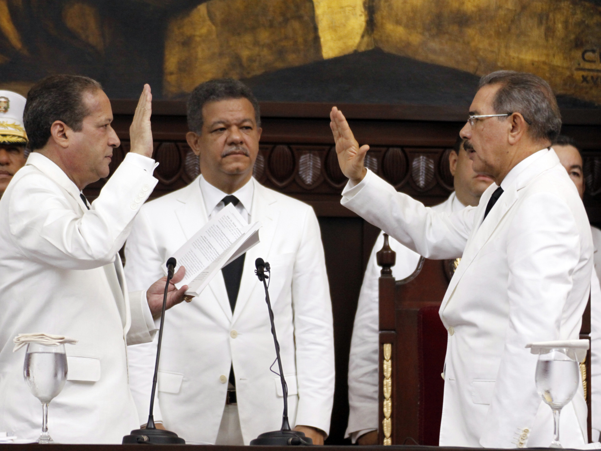 El presidente Danilo Medina Sánchez al ser juramentado como Presidente Constitucional de la República, período 2012-2016, por el presidente del Senado, doctor Reinaldo Pared Pérez, en presencia del presidente saliente doctor Leonel Fernández, en el Congreso Nacional.